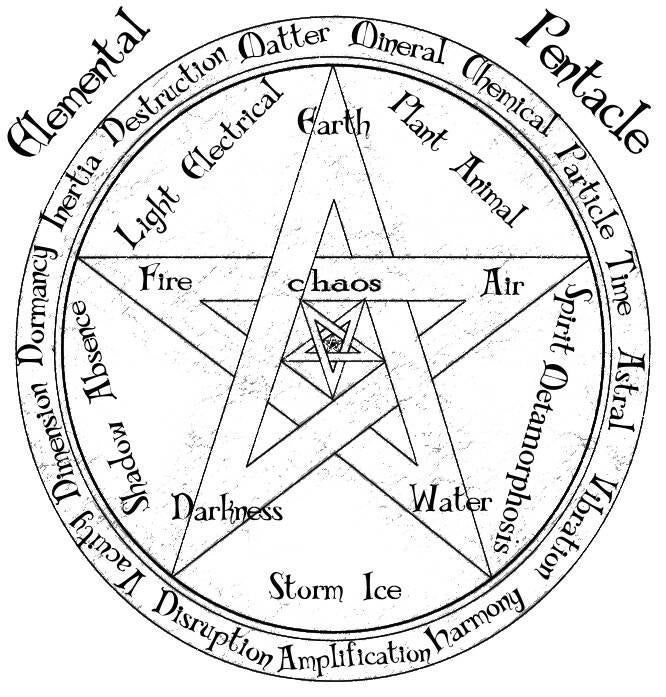- Theorem: Think of a goal that can be accomplished by the use of elements and choose the arcanas and aspects from the elemental pentacle that can accomplish that goal. Visualize clearly how those aspects shall achieve the chosen objective. Practice this exercise until your goal has been achieved. Gain +1 skill or power upon success.