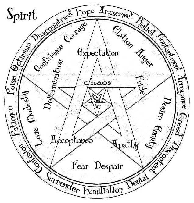 [3] Pentacle of the Spirit: This is perhaps the most unpredictable and therefore the most mutable of all the Pentacles other than the Pentacle of Arcane. There is a basic cycle to the arcana of spirit, which reflects emotion, perception and impression. Through Acceptance comes Determination, and through Determination comes expectation, and through expectation comes pride, through pride comes apathy, and through apathy comes acceptance. This is without a doubt the flimsiest of all models because of all pentacles, the spirit is the most malleable. Still, this order does explain the basic cycle of the spirit, while of all pentacles, these intersect the most.