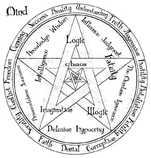 [4] Pentacle of the Mind: This pentacle is closely related to the spirit pentacle, which is based on emotion, while this pentacle is based on logic. There is no true order to logic other than what an agenda dictates logic should be, thus the order of this pentacle is arranged according to the Pentacle of Life Model... Creative logic begins with imagination, Progresses towards intelligence, intellect climaxes with true logic, then declines with fatuity, and collapses into the illogic of self-deception. Once rationalization is overcome once more by the imagination, can intelligence be recovered and logic be achieved once again.