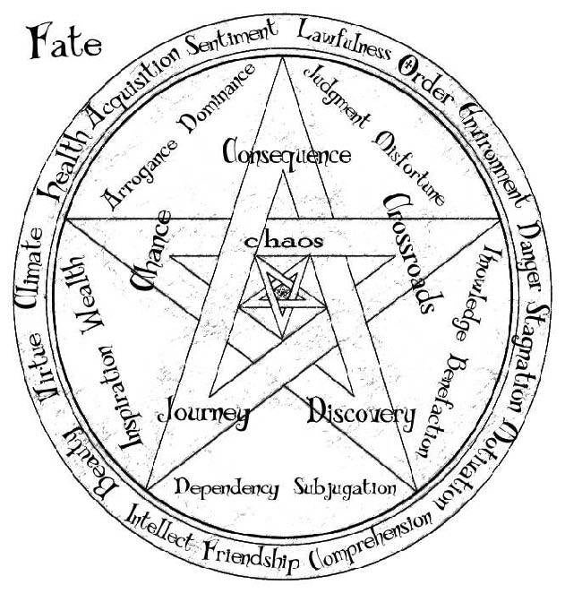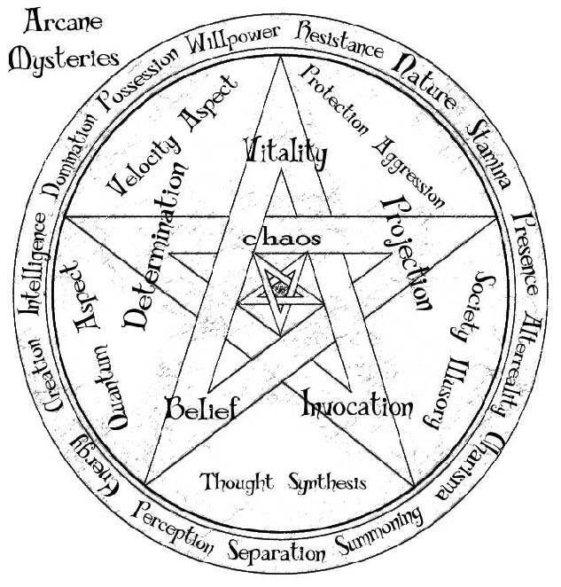 [1] The Life Pentacle of Chaos: The Life Pentacle represents all the driving forces of the universe; its Arcana are creation, evolution, adaptation, balance, decline, and finality, and is the main pentacle which all other pentacles stem from. The order of each Arcana, Aspect and Phase of chaos represents the cycle which these aspects tend to revolve in, although unpredictability may cause disruptions in the usual cycle. The Arcana of the Life pentacle are creation, progress, climax, decline, and cessation, which is the natural order of the cycle of life and the elements which make up all things. The two Phases which follow the aspects join the Arcana before and after each phase; while the Aspects on the outside ring are results of the Arcana leading to and from those Aspects. Each aspect and phase is relative to its predecessor and its forerunner and leading to the next Arcana defines the cycle. These arcanas and their aspects often cross to become part of the axis, whereby a new cycle of evolution and adaptation occurs to effect necessary change. The Major Arcana is the perpetual cycle of chaos and all of its crossroads intersecting.